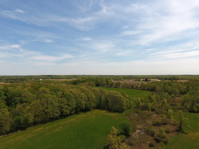 Wooded sections consist of oaks, maples, cherry, and poplar. Trees are all different sizes from towering oaks, to sapling poplars. Plenty of places for a tree stand. Farm ground is split up into 7 areas, seems well drained, and is currently planted to clover and alfalfa. A creek meanders thru the entire acreage from west to east. Couple areas along the creek have expanded into wetland spots providing both cov...