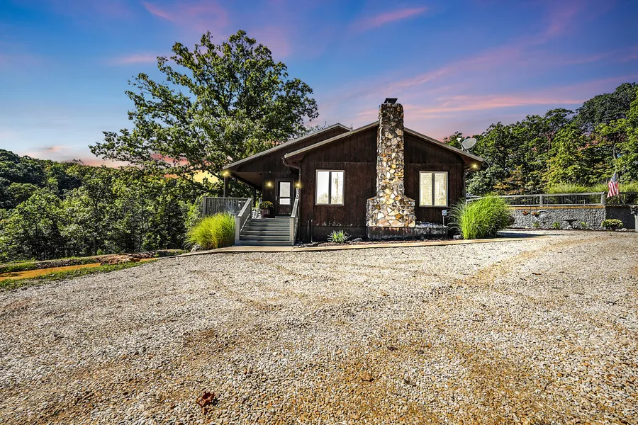 Stunning country retreat on 48 acres! This 3-bed (3rd non-conforming), 3-bath home features vaulted ceilings, hardwood floors, and abundant natural light throughout the main level. Enjoy scenic views from the covered porch off the master and dining room. Kitchen boasts stainless appliances and solid surface counters. Large master bedroom with a sitting room and walk in closet. The spiral staircase leads you to the lower level that has card table, pool table, oak bar, full bath, and 3rd bedroom. Outside: 45x30 detached 3-car garage w/200 amp service, landscaped in-ground pool, gazebo, and pool house. Explore trails, creek, cave, and prime hunting spots with abundant wildlife. A rare find with charm, privacy, and adventure! Truly a must see to believe what this private get away has to offer