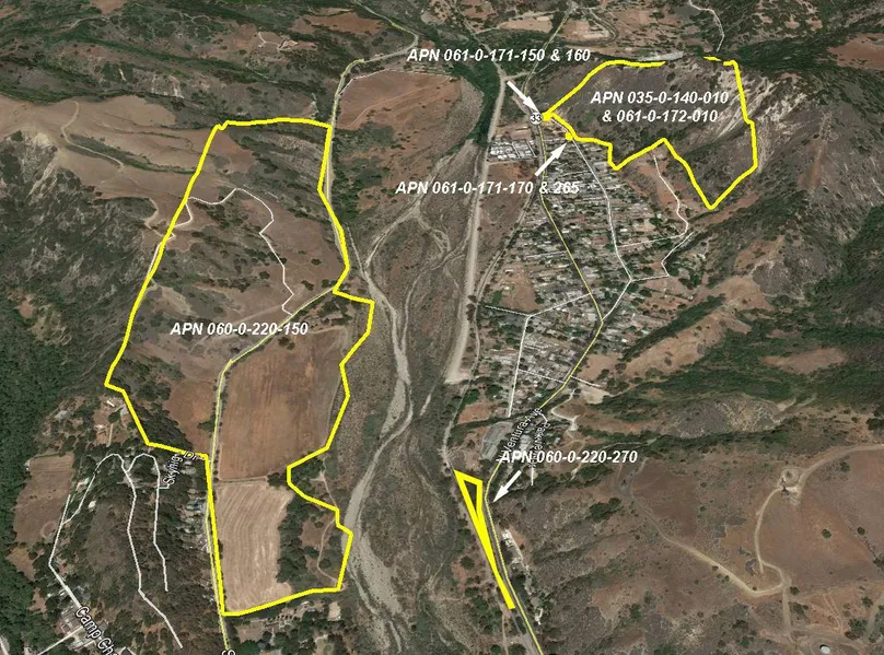 This historic ranch has been in the same family for generations. The main piece of 123 acres runs along the Ventura River, great for a first class equestrian center or vineyard. (A world class vineyard is located a few miles up the road.) Property consists of one legal lot comprising 8 APNs. 123 acres in main parcel straddling Santa Ana Road, including about 40 acres of flat and a grassy hillside pasture that would be ideal for a view home. The Nye Ranch has two water wells, one of which tested at 500 gpm in 2011. Both are located on APN 060-220-15.