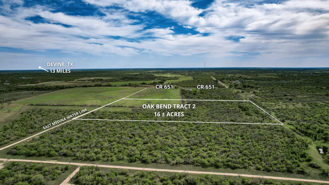 Located down a private easement off CR 651, less than 1 hour from San Antonio, the 16+/- acre Oak Bend Tract 2 provides a great opportunity to own a manageable sized property within the highly sought after Medina Valley ISD. The property offers great privacy and is an easy commute to San Antonio and just minutes from major retailers in Devine, Hondo and Castroville. While a blank canvas, there is an East Medina water line located on the eastern boundary and electricity is located nearby. The property is ready to be built to one's desire. Whether you are looking for a place to build your dream home in the country or weekend getaway, this property won't disappoint. Additional acreage is available.