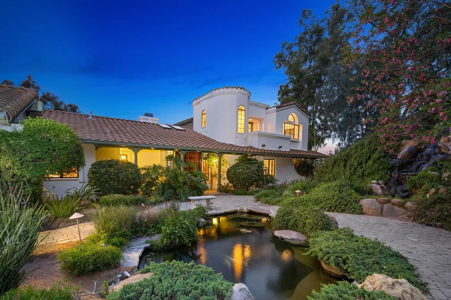 Nestled in the quaint neighborhood of Rancho Santa Teresa Estates, sits the stunning and versatile 8.46+/- acre Oakana Country Estate offering the perfect balance of comfortable living, equestrian amenities and tranquil countryside charm. Situated on a tree-lined street, this private gated property features beautifully landscaped outdoor spaces and scenic vistas that will take your breath away. As you approach this exquisite home, you are greeted by a mesmerizing waterfall and captivating Koi Pond amidst lush gardens, vibrant blooms and verdant foliage. The custom-built Spanish-Mediterranean 3,425 +/- sf home with 3 bed/3 bath boasts a spacious and open floor plan, with elegant finishes and modern amenities throughout. Enjoy the gourmet chef's kitchen with high-end appliances and granite countertops, or relax in one of two expansive living room spaces each featuring a cozy fireplace and views of the surrounding mountains. This home also features a main level primary suite with large walk-in closet including custom shelving, and a luxurious en-suite bath featuring soaking tub and walk-in shower with curved glass creating the ultimate bathing experience. A separate bonus room with fireplace is ideal for library, study or home office. The two secondary bedrooms each with a private bath are great for children, guests, or as a craft room or office space. Whether it's the soft morning glow, the gentle afternoon radiance, or the golden hues of sunset, the natural light that graces every room through skylights and windows elevates each space to new heights, transforming it into a haven of serenity and beauty.