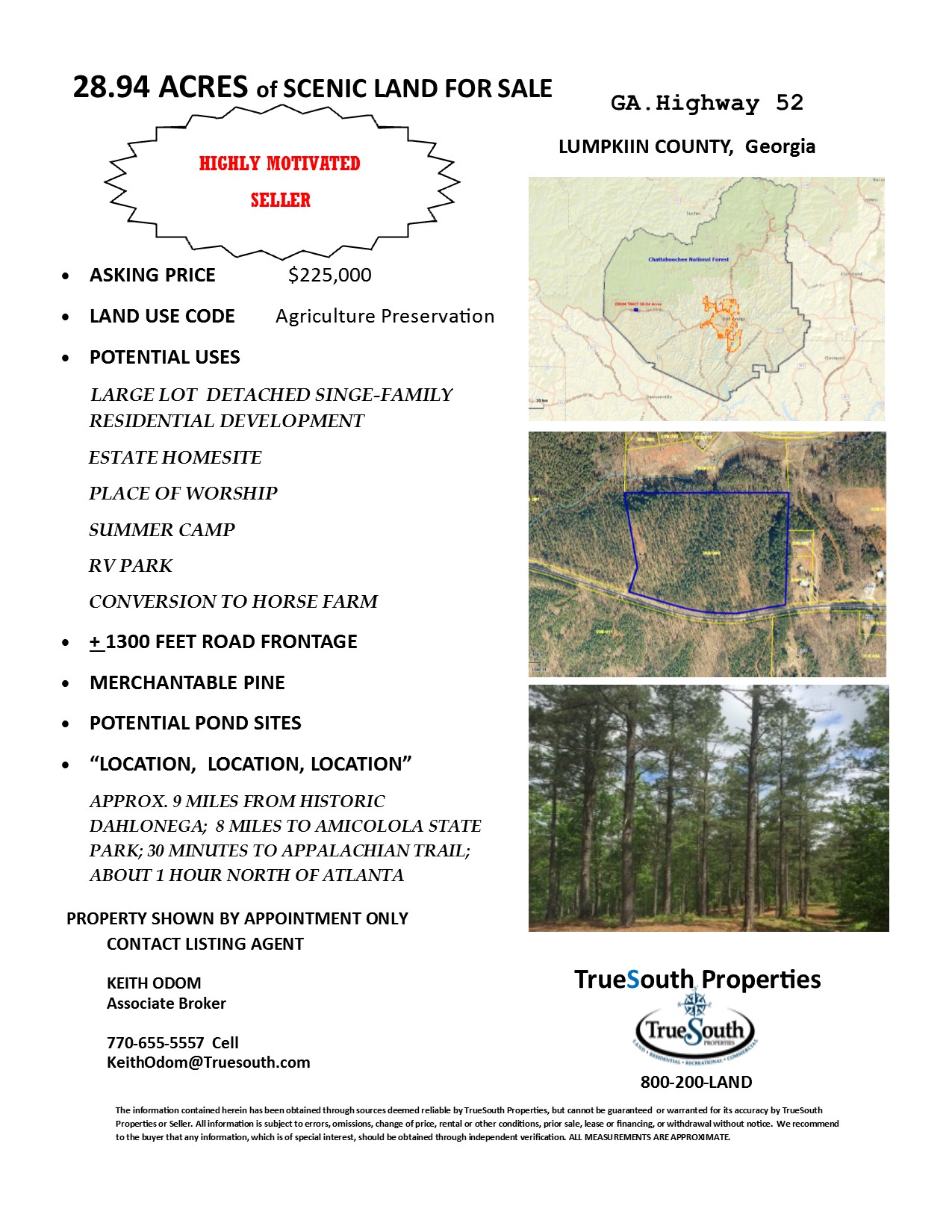 Enjoy a "breath of fresh air" on 28.94 scenic acres located on GA Highway 52 approximately 9 miles west of historic Dahlonega in Lumpkin County, Georgia.The property is only about 8 miles to Amicalola State Park. This property at its highest point is approximately 1800 feet above sea level and is in an area of several large parcels of property. Predominantly stocked with merchantable pine and non-merchantable hardwoods. A temporary access road and potential residential building site have been constructed. Potential small lake site. Excellent location for your primary or seasonal home. Great investment potential.