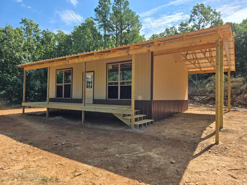 Cabin: There is a newly constructed cabin on the property with a 24 ft x 30 ft main living area, a 6 ft x 30 ft covered front porch and a 10 ft x 30 ft carport area. The cabin sits on a cleared and levelled pad, has a post and beam foundation, metal roofing and a 9 ft stud wall. The cabin is currently a shell and not finished out on the inside. There are two 6 ft x 7 ft windows and one walk through door. The new owners can frame up interior walls, frame in more windows and even another exterior door if desired.