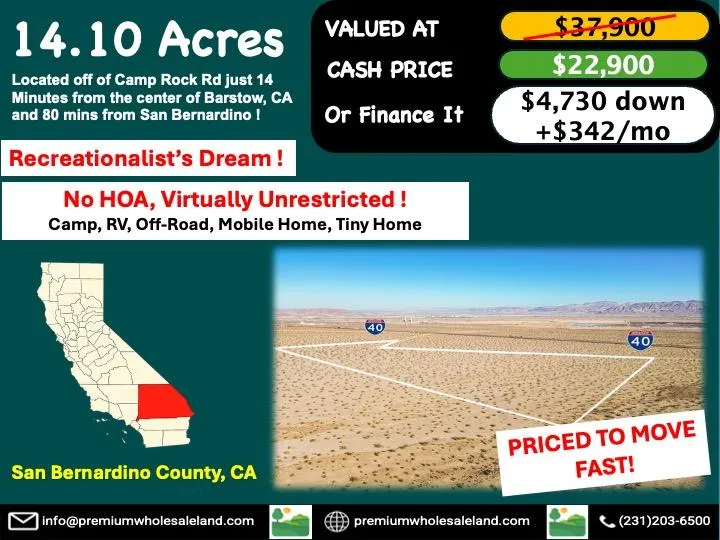 Calling all recreational enthusiasts! Escape to your own 14.1-acre desert retreat in Barstow, CA, zoned Resource Conservation (RC) and offering endless potential for your dream single-family home, tiny home, or mobile home. With no HOA and short-term rentals allowed, you can also use it as a private getaway for camping, off-roading or RVing. This property features a gentle slope, natural desert brush, and stunning panoramic views, with easy dirt road access maintained by the county. Located near iconic attractions like Calico Ghost Town, Big Bear Lake, and Mojave National Preserve, you'll enjoy the perfect mix of peace, adventure, and convenience. Dont miss this chance to own a spacious desert property with limitless potential!
