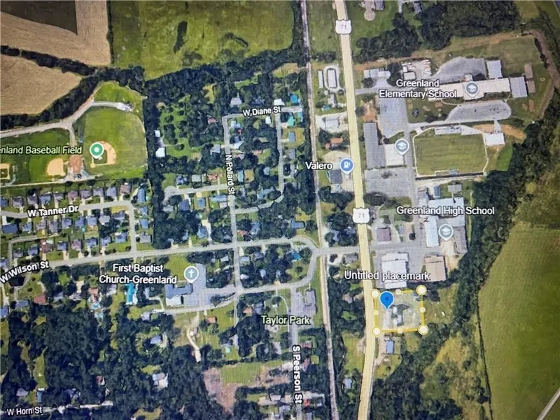One Acre Adjoining Greenland Schools, With 271 feet of Main st. frontage. No value placed on home or out buildings, All improvements on property are sold as is.