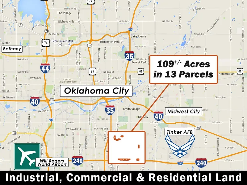 All parcels located northeast of the I-35 & I-240 Junction between SE 44th St and I-240; Sunnylane Road and I-35.