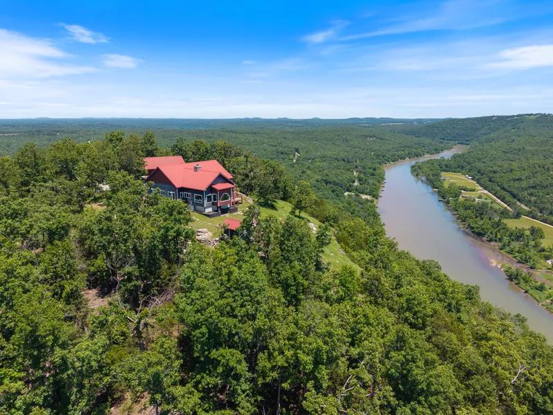 Jerrys House on Ollie Mountain captures the elevated and panoramic views of the majestic upper White River like no other, with hundreds of square feet of windows providing unobstructed views south down river and northeast upriver. This custom-built timber frame lodge was completed by the owner and famed timber frame contractor Rodney Haines from LaGrange, Georgia in 2017. The primary lodge is 2,650 square feet and features open air and open living space anchored by a magnificent floor to ceiling stone fireplace. The attention to detail is never ending with hardwood, antique brick, and tile flooring throughout. The walls are natural wood wainscot and sheetrock. The vaulted ceilings are tongue and grooved pine, accented by the exposed, solid wood beams, secured with driven wooden pegs. The spacious master bedroom has carpet floor covering and majestic outdoor views, flowing into the very custom and comfortable master bathroom featuring a copper soaker bathtub, oversized stone and tile walk-in shower, toilet closet, and double vanity. The chefs kitchen has granite countertops, a massive custom island for food prep and guest gathering, all stainless-steel appliances, a gas range top, and a walk-in, sliding barn door access pantry. There is a large, comfortable guest bedroom with carpet flooring, a walk-in tile shower, lavatory, and toilet closet. Youll appreciate the laundry room with its double stack washer and dryer, and built-in folding area. There is also a half-bath off the primary entry foyer. Additionally, the home includes a hobby/crafts room and several closets / storage areas. Wonderful decks surround the east, south and west sides of the lodge and are complimented by a 10 x 13 screened-in porch overlooking the river. Just southeast and below the main deck is the Buzzard Barn a detached building with heating and air that could house an overnight grandchild for an adventure or be an artist space for painting, potting or other hobbies.