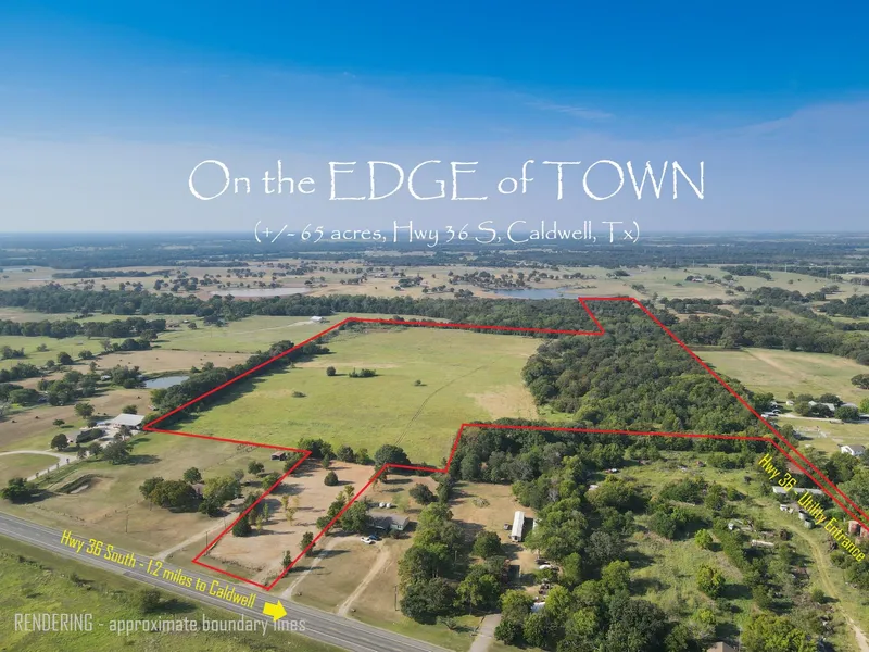 ON THE EDGE OF TOWN +/- 65 acres just 1.2 miles south of Caldwell with CITY WATER, Hwy 36 FRONTAGE, FIBER OPTIC available, ELECTRIC on site, cleared pastures, nice wooded back drop, multiple access points from Hwy 36, high visibility, two way traffic access, and a tons of versatility. Currently used as recreational/grazing land the property is nicely suited for multiple uses: COMMERCIAL, INDUSTRIAL, RESIDENTIAL, MULTI- FAMILY or a convenient and well-connected RANCH property with Ag exemptions in place. Investors, Ranchers, Home builders, and commercial developers dont miss this one!