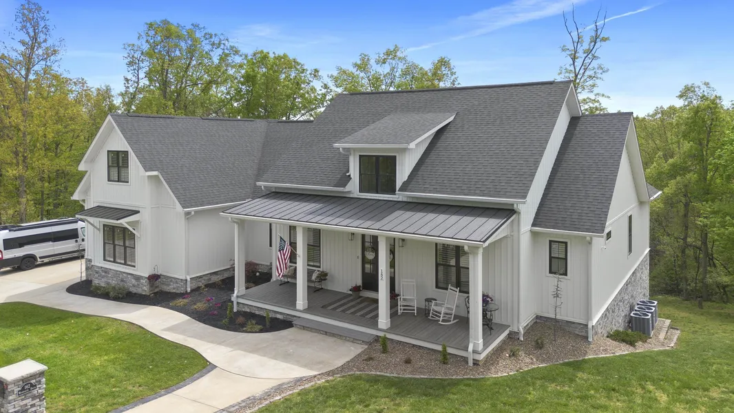 While many Realtors boast that a listing “has it all,” this stunning new home truly delivers. With 6363 sq. ft., this is definitely not a drive-by. It’s like having two homes in one! Situated on 2.16 wooded acres, this expansive 6-bedroom, 5.5-bath modern farmhouse offers numerous and thoughtfully designed rooms! Step onto the inviting 32-foot front porch and into a vaulted foyer that opens to a breathtaking two-story living room with a stone fireplace & gas logs. The open-concept layout continues into a covered porch and a gourmet kitchen with a Kitchen Aid appliance package with double ovens (to include European heating element/fan) and gas powered Viking cook top, quartz countertops, a spacious island, and a triple-stage, clearly filtered water system at the kitchen sink. Enjoy your morning coffee in the light-filled breakfast room with views of the woods, and store everything you ne...
