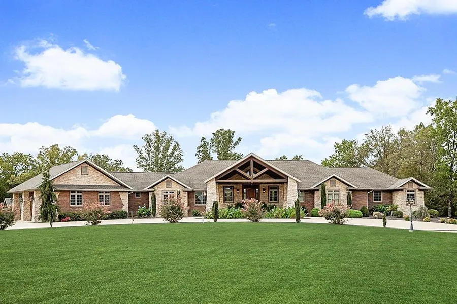 Beautiful One-Of-A-Kind Estate located in the Ozarks of South Central Missouri on 30 Acres. Home offering over 5400 Sq Ft. Built in 2009 this Custom Brick and Stone home with circular drive and covered entry is professionally landscaped with professional exterior accent lighting, a large deck on the back of the home, private master bedroom deck and covered patio area from walk-out basement. Entering the home you will find custom tile work, wood floors brought in from Vermont, large living area with cathedral ceilings & custom timber beams, fireplace and large windows leading to the main outdoor living space. There are 3 bedrooms and 3 full baths on the main level and 3 bedrooms and a full bath on the lower level. The large kitchen with breakfast area includes an oversized island