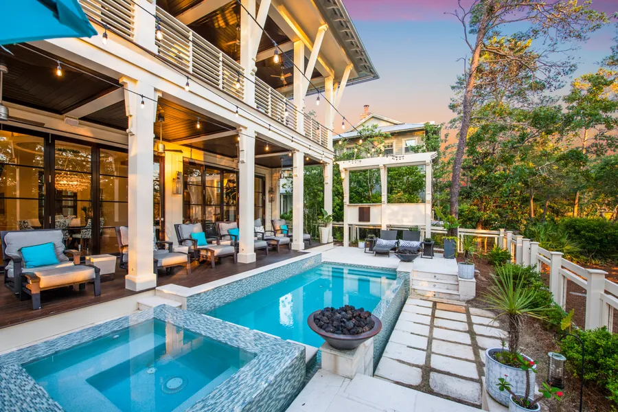 A truly one-of-kind opportunity, this impressive five bedrooms, five full bathrooms and three half bath WaterColor estate nestled along the peaceful shores of Western Lake offers a luxurious lifestyle not easily attained in the 30A area with every desirable feature imaginable including a lake front infinity edge swimming pool with outdoor living area, a high-tech theater room with wet bar, an elevator, recently updated furniture and finishes, and a two-car garage. Designed by Savoie Architects, the elegant, contemporary styling of this residence sets it apart from other community properties. A welcoming covered front porch is highlighted by a stunning 11' mahogany front door with custom beveled glass. The gracious foyer leads to an open concept living and dining area with gorgeous Brazilian walnut floors and walnut wine display and ceiling accents including a built-in entertainment cente...