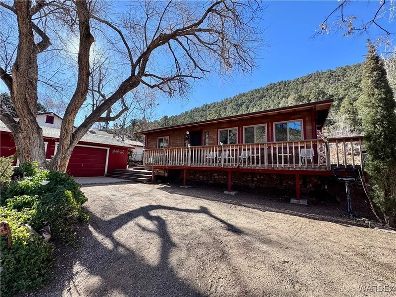 Rare and highly desirable location in the Hualapai Mtns, but only about 10 minutes from town! This eclectic cabin style home is nestled at the base of a mountain, has 3 designated bedrooms, but could be 4/5 bedrooms if you wanted. Has a den and a sunken TV room! Would make a great private or vacation home or a cute rental getaway! Spacious living room with dining, a wood stove and open kitchen. All new windows, patio doors and new roof! Large laundry room and big walk in pantry! Pocket doors and deep window sills! This home has so much character and personality! There is even a small earthen cellar! Some furniture, decor and contents can stay or not, you decided. Fantastic wrap around deck for entertaining! Wait there's more! THREE garages! A spacious boat garage that also houses the well house, with lots of shelving, a 2-3 car garage with a Service Pit! Shelving and workbenches, and another 1.5 car garage! The property around the home is fenced, but then you have another approximately 200 x 100 feet of back yard a beautiful hillside going up the mountain full of pinion pines and a seasonal stream. Wildlife galore. And there is more! Plenty of outside space for parking toys! Brand new septic system being installed! From the property you may go exploring up the mountain behind the property, it is open range. This is a must see opportunity!