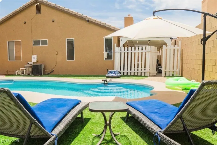 Single-story home in Silverado Ranch featuring 3 bedrooms, 2 bathrooms, and a private pool. This property offers low-maintenance landscaping for easy upkeep. Energy-efficient solar panels helping to keep utility costs low.