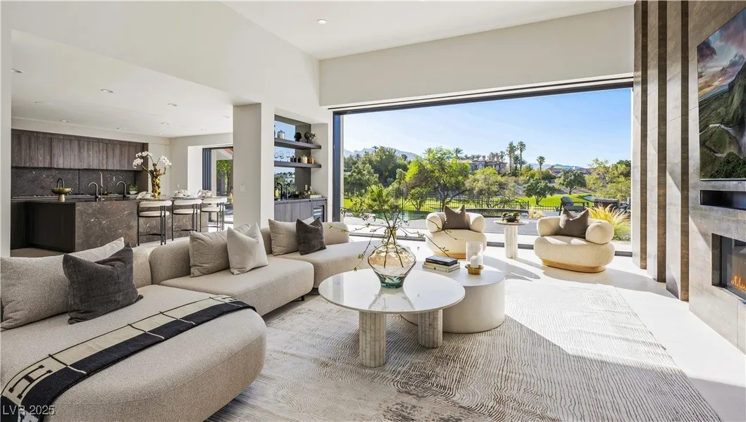 Behind the guard gates you will find tree lined streets and lush landscaping that provide a welcome oasis from the desert that surrounds the city. A completely rebuilt and reimagined contemporary masterpiece with a timeless style. From the moment you enter the private courtyard you notice spaces for al Fresca dining or lounging by a fire feature. Entering the home through the 9’ glass pivot door gives you an immediate feeling of grandeur and welcomes you to a home filled with natural light luxury designer finishes. Limestone floors, Miele Appliances, Italian quartzite natural stone counters, custom fabricated kitchen cabinets and closets, 200 bottle wine cellar, smart home system just to name a few. Pocket doors throughout the home open to the backyard oasis. Designed to entertain and delight while maximizing stunning views of TPC Summerlin golf course. Relax on the wet deck of the infinity edge pool, cook amazing meals in the outdoor kitchen or lounge by the second fire feature.