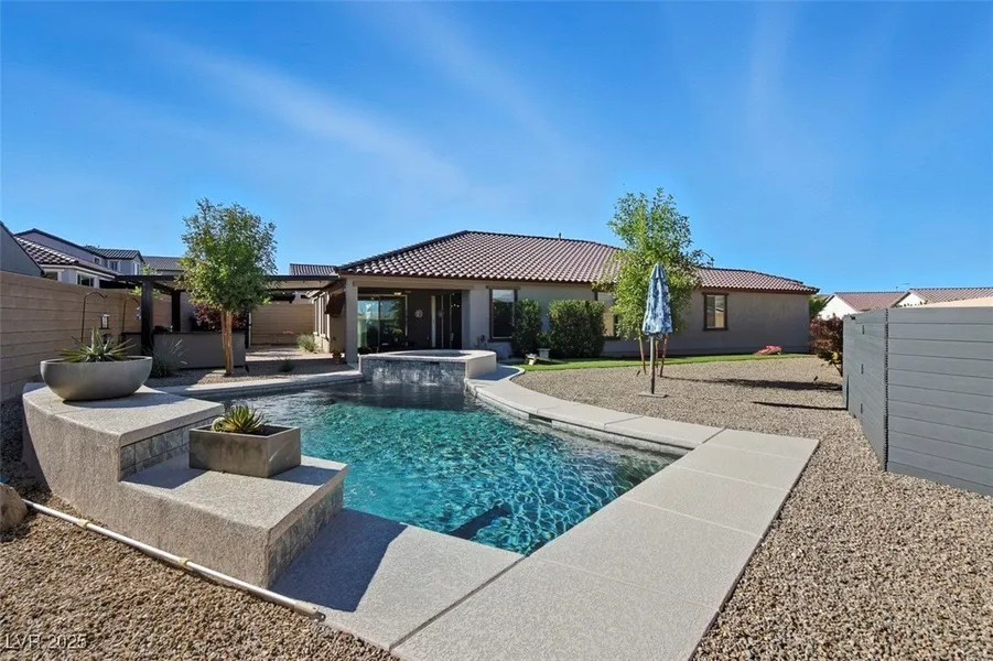 Welcome to 9953 Blackbark Court—an exceptional home in the desirable gated community of Sky Canyon. Situated on an oversized lot, this property offers a true indoor-outdoor lifestyle with a contemporary pool and spa, covered patio, paver driveway and walkways, built-in BBQ, full outdoor kitchen, and mounted outdoor TV—perfect for entertaining. Inside, you’ll find a spacious open floor plan with beautiful luxury vinyl plank flooring, stylish finishes, and extensive upgrades throughout. The gourmet kitchen features top-of-the-line stainless steel appliances, quartz countertops, an oversized island, and a large walk-in pantry. The luxurious primary suite boasts views of the backyard and pool, a large custom walk-in closet, and a spa-inspired bathroom with an expansive walk-in shower. Completing this impressive home is an oversized 3-car tandem garage and thoughtful design elements that blend comfort, elegance, and functionality in one of Las Vegas’s most sought-after communities.