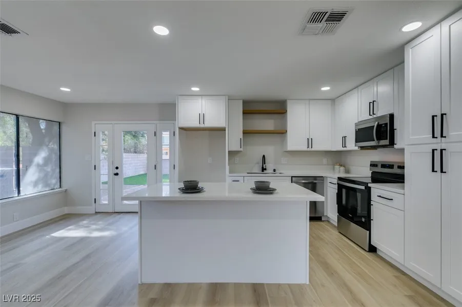 Enter this stunning corner lot single story renovation to vaulted ceilings and an open concept floor plan pouring in natural light. NEW White Shaker cabinets contrasted by matte black handles. Modern Quartz countertops, stainless steel appliances and recessed LED can lights. Both Bathrooms have been remodeled top to bottom. The curb appeal matches the interior with fresh paint in attractive contrasting colors. Warm luxury vinyl plank flooring that can withstand the family pool parties. Accented fireplace makes a bold unique statement piece. Freshly painted inside including upgraded 5" baseboards. New light fixtures inside and out, kitchen & bath faucets, door handles, ceiling fans, chandeliers, toilets, light switches, everything you need to be able to simply move in and enjoy all this incredible home!