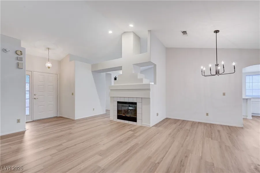 A two-way fireplace in the living room creates a warm and inviting atmosphere, perfect for gatherings. The kitchen is equipped with sparkling white quartz countertops, a breakfast nook, and a breakfast bar, making it an ideal space for casual dining.