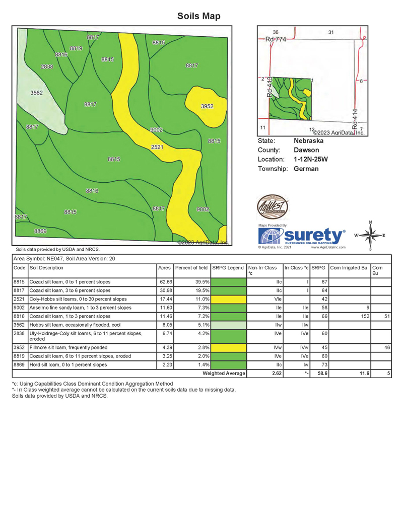 A great opportunity to add an outstanding pivot-irrigated farm to your land holdings. The farm is located in Dawson County, which is known for its fertile soil and favorable climate conditions for crop production. This farm offers good access off a gravel road, is near several competitive grain markets and includes all electric irrigation equipment with the sale. A majority of the farm is comprised of productive Cozad silt loam soils.