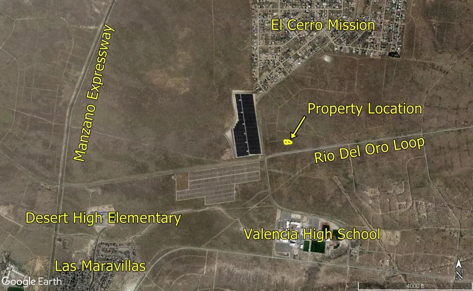 They are about 0.4 mile south of the El Cerro development, and about 0.5 mile north of Valencia High School. Rio Del Oro Loop, the main road through the subdivision, is 106 yards away. Bonita Vista Boulevard is 257 yards away. Power is now about 282 yards away, at the intersection of those two roads at the corner of a solar array. The Manzano Expressway is about a 1.5 mile drive away.