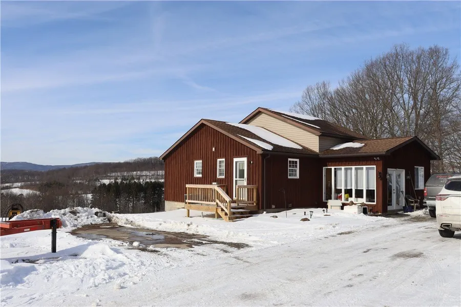 The perfect combination of Primary Home with Structures to accommodate your business. 3 Bedroom ranch, Detached 40' x 100' (16' Ceiling Height) commercial use building, second Detached building with heat and water currently used as a "Pet Motel", Outdoor wood burner in its own wood storage shed used to heat the large building, 40" x 50" foundation ready for a new building. The home features 3 bedrooms including an ensuite primary bedroom, eat-in sized kitchen, main level laundry, lower level family room with stone woodburning fireplace, Native wood paneling and trim, Solid oak 6- panel interior doors. Rear wrap around deck, side entry deck and front enclosed porch. Excellent long distance views.
