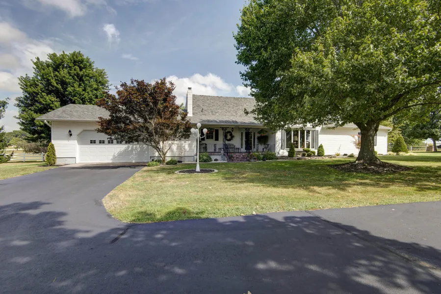 Remarkable home located on 12.04+/- acres with two entrances, one with direct access and Highway 160 frontage! This meticulously well maintained home features a split three bedroom floorplan with two living areas and three baths. From the front porch, you're greeted with one of the two living areas adjacent to spacious kitchen with separate dining area complete with custom glass front cabinets, quartz countertops, tile flooring & breakfast bar leading to the laundry area and back porch overlooking the custom waterfall fountain, the heated in-ground pool with diving board and slide, pool house with its own half bath & bar, perfect for summertime entertaining!! Back inside the main level of the home is the 2 car oversized attached garage with pellet stove, painted floors, work area, plentiful storage and access to the partial basement & storm shelter. Moving back inside to the living area ...