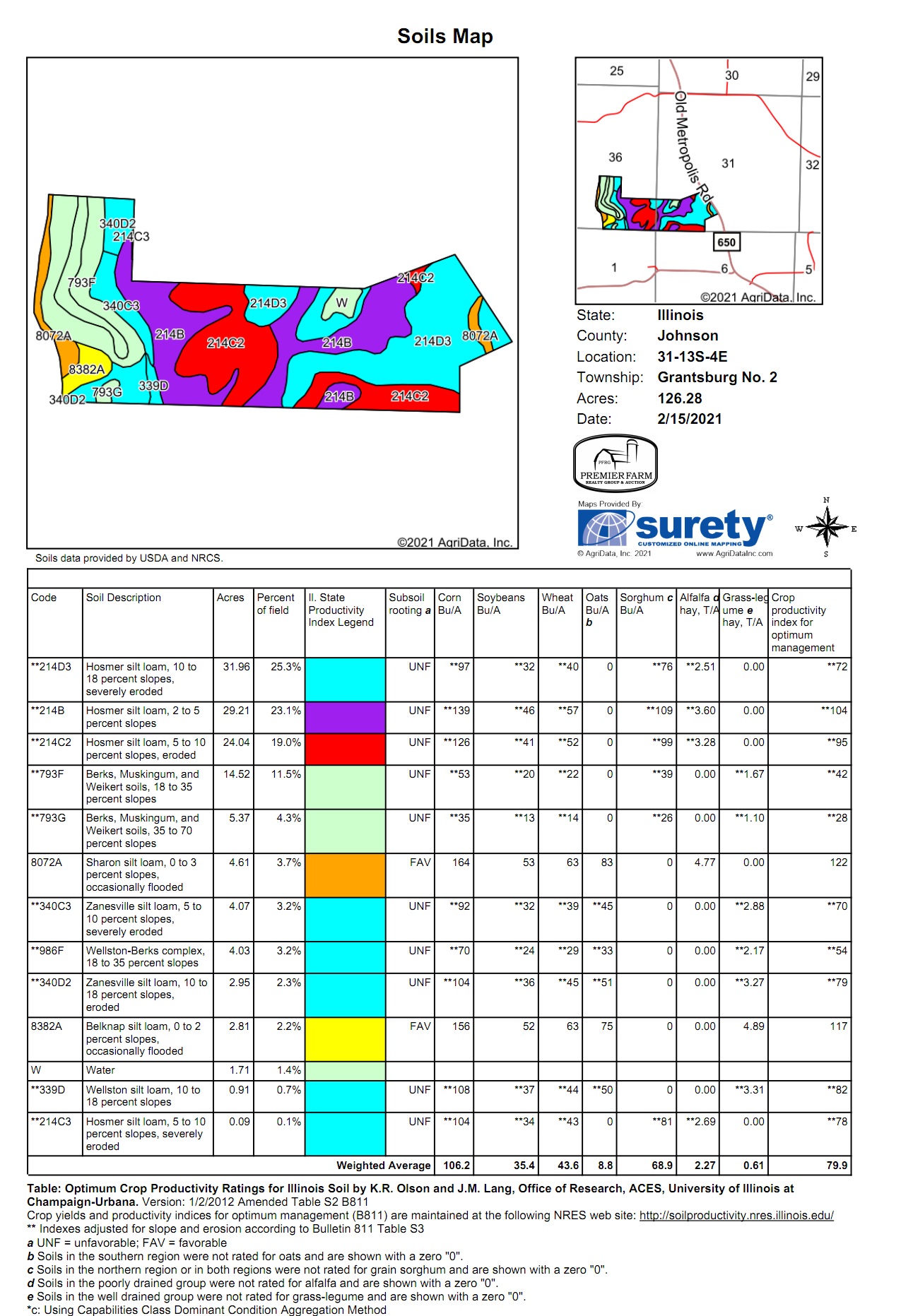 Search for detailed parcel information including; Elevation & Vegetation Maps, Ownership Information, Detailed Parcel Information, Crop History Map, Soil Survey Productivity Data, and more.