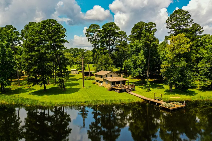 Improvements consist of a 3 / 2 frame cabin situated on the western shore of the lake. This well appointed structure features a large open concept kitchen / living room / dining area as well as a second recreational room / den and three bedrooms upstairs. The structure opens onto a wood deck overlooking the lake with a wood deck walkway connecting the pier. The pier has a fish cleaning station and plenty of deck space to fish and enjoy the view. The area surrounding the cabin is also improved with a two-car carport, a storage building and a water well.