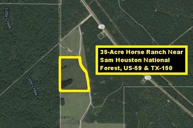 Owner Financed! Great Opportunity! 35-Acre Horse Ranch Near US-59 & TX-150. Property Borders the Edge of Sam Houston National Forest with Breathtaking Views! Jiggs Hay Pasture Pivot Ready & Few Clusters of Pine Trees. Down the Street from Big Creek Scenic Area & Lone Star Hiking Trail. Has Electricity! Needs Well & Septic! Ready for Your Horses and Construction of Your New Home & Barn on this Cowboy Paradise Only 60 miles from Downtown Houston & Texas Medical Center. 45 miles to Bush Airport, The Woodlands & Exxon Complex! Adjacent 35 Acres of Pastures & 275-Acres w/Horse Facility/Event Center Located Down the Road are Also For Sale Separately! 193-Acres of Timberland Located Across the Road Can Be For Sale!