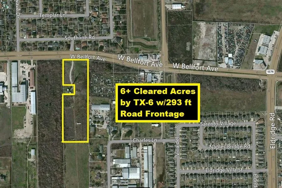 Owner Financed! 6+ Cleared Acres w/293 ft W. Bellfort Ave Frontage by TX-6. Partially Fenced. Hot Location! Close to Grand Parkway/TX-99, Hwy 59/I-69, Sam Houston Parkway, Westpark Tollway & Highly Desired Sugar Land. 20 miles to Texas Medical Center, Downtown Houston & Hobby Airport. Perfect for Industrial Warehouses, Distribution Center, Office/Warehouse Park, Self-Storage Facility, Multifamily Development, Hospital/Urgent Care, Medical/Dental Clinic, Retail Center, C-Store, Church, Education Center. Tower is not on property! Very Low Taxes! Located in MUD District!