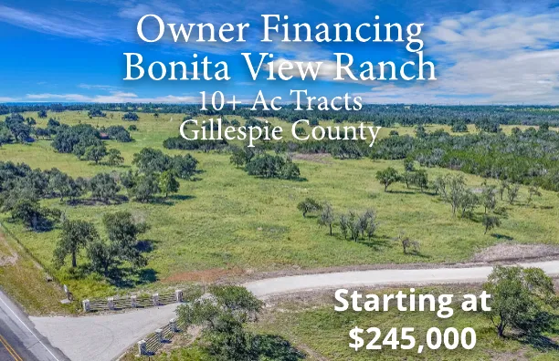 Bonita View Ranch is a new, small gated ranch community located just minutes north Kerrville. The 214 acre community offers 10+ acre tracts starting at $245,000. Owner financing is available. The rolling terrain varies from heavy cover to lush grassy areas dotted with large hardwoods. The land is horse and livestock friendly and holds native game. Each tract has nice building sites, ready for you to build your dream home. The gated entrance gives an additional layer of privacy to an already private setting. Bonita offers a peaceful and quite setting along with the conveniences of being close to all that Kerrville has to offer, and is only a hour from NW San Antonio. It's a wonderful place to get away from the noise of the city and enjoy a quieter lifestyle.