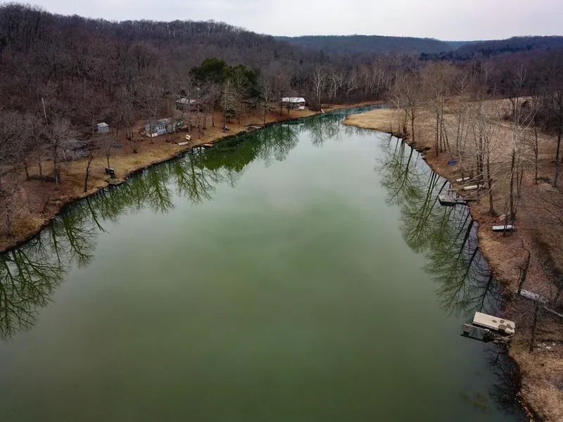 The balance of the property boasts incredible amounts of wildlife including deer, turkey, and small game. In walking the property I found thick bedding areas and funnels created by the terrain loaded with deer sign. Giant oak timber ridges mixed with cedars and other hardwoods are connected by a series of trail systems allowing access to all different parts of the property. Gravois Creek, a beautiful rock bottom live stream runs into the west side of the lake and can be followed through a maze of bends and turns. Below the lake, there is a cave accessed by a trail that is sure to impress. The lake is stocked with bass, catfish, crappie, and bluegill and makes a perfect swimming hole.