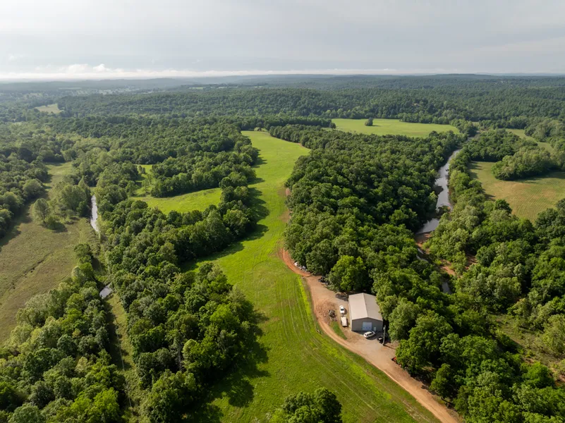 Nestled a mile down a private drive, atop a large bluff 100’ above Myatt Creek, is a 40'x60' shop house, with breathtaking views of the creek in two directions, as well as impressive views of the farm towards the north and east. Within the shop house, there's approximately 1,400 square foot that has been converted into 2 stories of heated and cooled living space, with a full kitchen, 2.5 baths, 1 bedroom downstairs, and two large loft bedrooms upstairs. The remainder is shop space and could be used in a multitude of ways. If the desire is to build your dream home, there are plenty of bluff-top sites with equal views just waiting for you! From the gated entry, you’re 4 miles from paved Highway 9, with easy access to Mammoth Spring or Salem, Arkansas.
