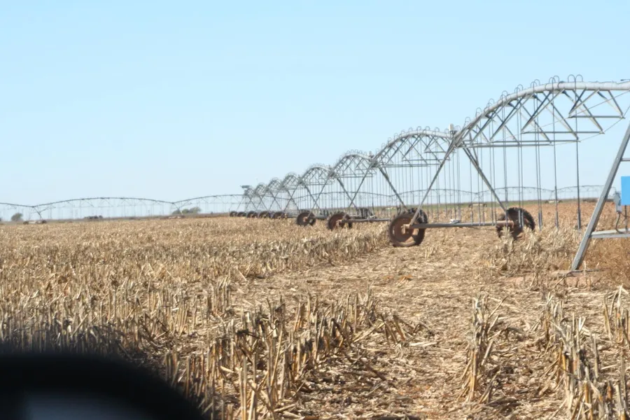 Description: Tract 2 is a very nice quarter section of irrigated farmland located in central Parmer County. The land has some slope to the south and appears to have strong producing soil. There are two wells that are producing a total of approximately 250 gallons of water per minute. The wells are equipped with turbine pumps. The natural gas engines belonged to the previous tenant and have been removed. The east well has an open hole to 502 with the water level at 452. These figures for this well log were completed in 2011. The west well has an open hole to 477 with water level at 400. These figures for the west well log were completed in 2002. There is a T&L Hydraulic Sprinkler System* 7 Tower*11.2 x 38 tires* Serial Number 6604* Corn and milo were raised on Tract 2 for the 2015 crop year. The corners are currently planted in wheat and will convey with the property. Sellers believe they own approximately one half of the mineral interests. Sellers will convey all mineral interests currently owned by Sellers. All wind rights owned by Sellers will convey to Buyer.