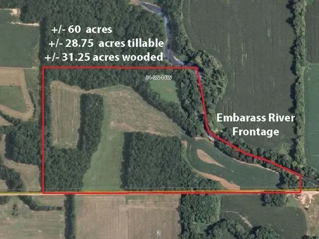 +/- 60 acres total, +/- 28.75 acres tillable, +/- 31.2 acres wooded. Annual farm income is $3,600 per yr. CP 33 field border program expires in 2020. High deer density with excellent genetics. Excellent whitetail deer wild turkey hunting. Heavily traveled trails, and creek crossings High bluff frontage overlooking the Embarass River. Tillable fields are ideal food plot locations, and excellent year to year income. Numerous home or cabin construction sites. Located at the end of a dead end road.