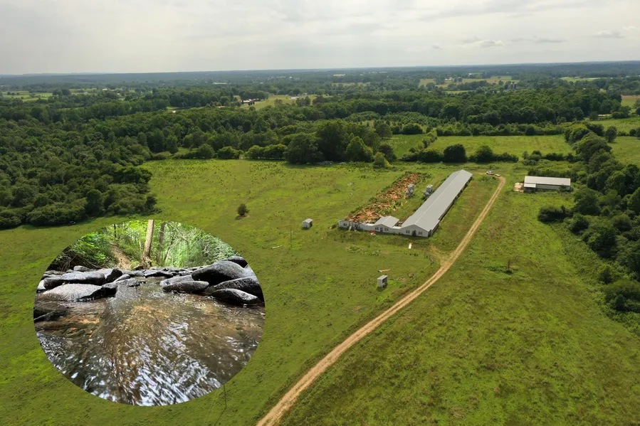 One chicken house was lost to a fire a couple years ago, but the other house is a 40’x400’ that still has some components that could be salvaged, or possibly recentivated and put back into production. There are Big Dutchman single belt nests installed in 2018, and various other equipment that could be of use. Power, water , and a well are all on site back to the chicken house area, as well as a generator. A 40’x80’ dry stack with litter is located adjacent to the chicken house. According to seller, work has been done through USDA and the property has been approved for construction of 4 broiler houses as well. Approximately 50% of the farm is in pasture and the remaining in timber. The southwest portion of the timber is very mature with towering hardwoods. More of the land could be converted to pasture if desired. A sAn incredible farm with fenced and cross fenced pastures, a flowing cree...