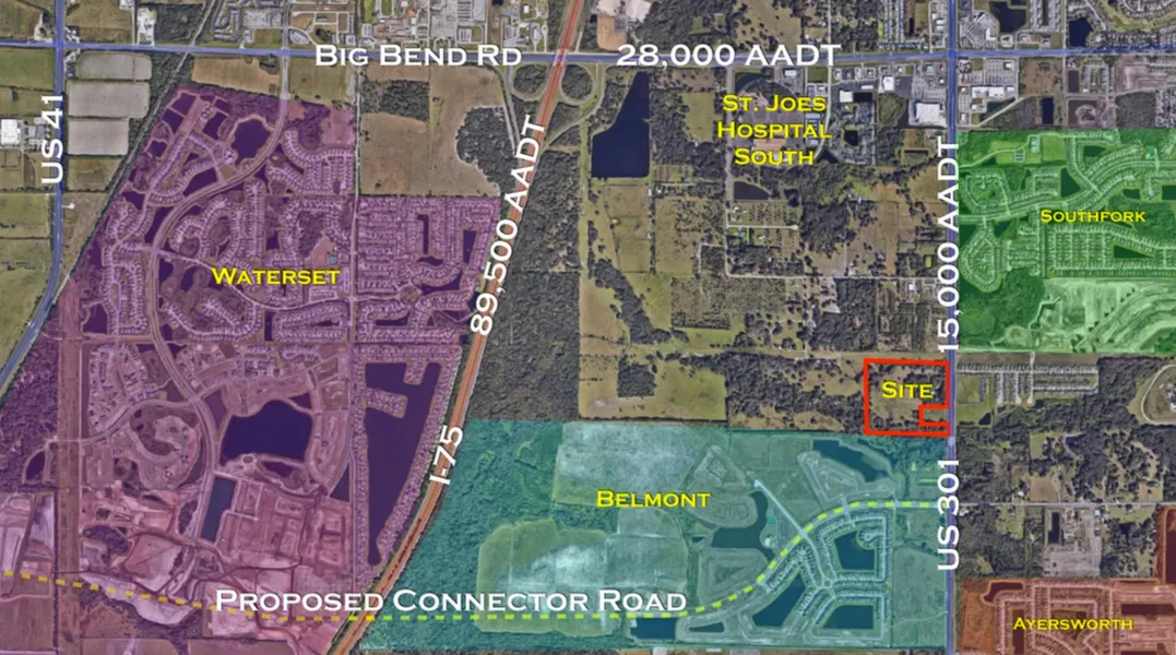 LOCATION DESCRIPTION - The property is located at 14011 US Highway 301 in Riverview, FL. It is on the west side of US 301, immediately north of the masterplanned community known as Belmont and directly across the street from the all new Charter School that is under construction. The property is south of Big Bend Rd and north of Sun City Blvd.