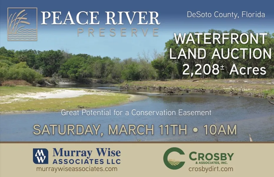 The Peace River Preserve is a 2,208 acre property that lies on both sides of the Peace River in Desoto County, Florida. This property has endless recreational opportunities, as well as valuable conservation opportunities with great potential for a conservation easement as the property has yet to be conserved. The property also has the potential for mitigation banks, habitat preservation, water quality mitigation, and university studies.