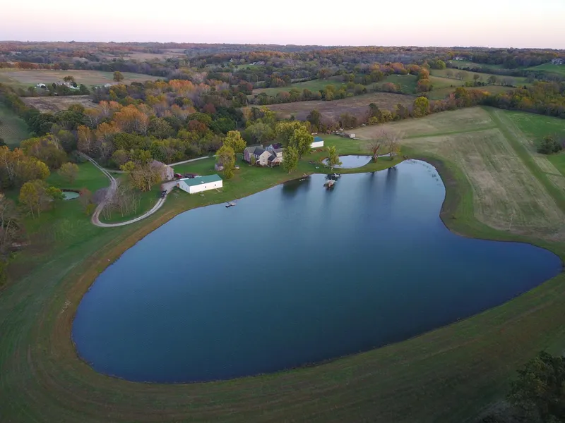 Located just North of Lone Jack, Missouri, this beautiful country home sits on 53 secluded acres at the end of a quarter mile long tree lined drive. Whether it be a single family residence, a bed and breakfast, or one of the most picturesque event spaces in Jackson County, this property has the potential to be whatever the buyer could imagine! The low maintenance 2 story partial brick home contains 5 spacious bedrooms and 4 bathrooms. An open family room/kitchen concept welcomes you as you walk through the custom built Pine front door. The solid maple island top is a focal point of the open kitchen with excellent counter space. A panoramic view through the kitchen window lies a 23’ deep stocked 4.5 acre lake sitting just behind the house. The home utilizes an all electric ground source heating and cooling system which loops under the lake, making it very economical. The house has Pella windows, a laundry/mudroom, partially finished basement, attached 2 car garage, and excellent storage throughout. To enjoy the serenity that the property provides, there are 2 covered porches to enjoy the sunset or sunrise and a private porch off one of the upstairs bedrooms. In addition to the house, there is a 40’x60’ hangar with a 12’ ceiling, a detached garage, a historical 3 story barn, a root cellar, and a 36’x60’ concrete floor workshop with a custom radiant floor heating system. The lake has provided great fishing, swimming, and other recreational value ever since it was constructed. A portion of the land has been certified organic and produces organic hay and barley. A roughly 1,600’ maintained grass strip runway crosses the property providing opportunity to take off and land an ultralight aircraft. The balance of the land consists of 4 additional ponds, timbered treelines, deer, turkey, and small game. Don’t miss out on the opportunity to purchase an iconic property, with maximum seclusion, yet great proximity to the Kansas City Metro. For any additional questions or to schedule a private showing, contact Joey Purpura at 913.424.8415.