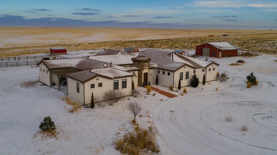 Peaceful luxury custom estate in country setting to fit your every want and need minutes to Parker and Aurora. Large home with timeless features. Enter front tower into a private courtyard with separate access to casita or to main house. Home has almost 6000 finished sq ft of rustic charm interior including two kitchen islands large enough to seat 16. Open kitchen is a chef's dream with large pantry, double refrigerator/freezer, 6 burner gas range, formal dining room with butlers pantry, family room with access to covered north patio, or interior courtyard. Need a extra spacious home office or room to home school. This house has you covered. Every room in the house is oversized. From the master bedroom to the mud room to additional bedrooms to finished basement and tons of storage. Gas appliances, tankless hot water heater, 2 Hvac with 4 zones, whole house well with Aquasana carbon + UV filtration, auto throw generator, interior and exterior speakers, hand trowel walls, ANOTHER covered patio to the east overlooking fully fenced steel arena or 70x80 garden area. Don't forget to see the Casita or in-law suite with living area, kitchenette, bedroom, bathroom and walk in closet. Home is situated to take advantage of the peace and quiet of the plains to the east and mountain views to the west, while living in the country with custom elegance. Only 12 minutes to King Soopers at Smoky Hill & Arapahoe Rd. New 25 year warranty steel fence with electric programmable gate surrounding front, side & horse arena. But wait, there is more.... finished basement with bedroom, bathroom, game room & media area with all media equipment & pool table included. 3 storage areas. Outside you will find a large barn with 2 stalls, room for 6 more, shed with loft & water/electricity accessible, chicken coop, two lean-to's, 35 acres with a pond, fruit trees & more, all on drip lines, 5g wifi. So close to town and yet the peace and quiet of country living with an almost new home.