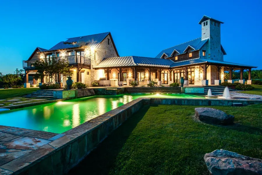 The updated 7,863 sf main house with a stone and rock exterior, and metal roof, includes 100 year old wood flooring from East Texas. Ideal for entertaining large and small groups, the tastefully decorated home features a spacious Great room with a 30 foot vaulted ceiling with wood beams and floor to ceiling stone wood burning fireplace. A large chefs k...