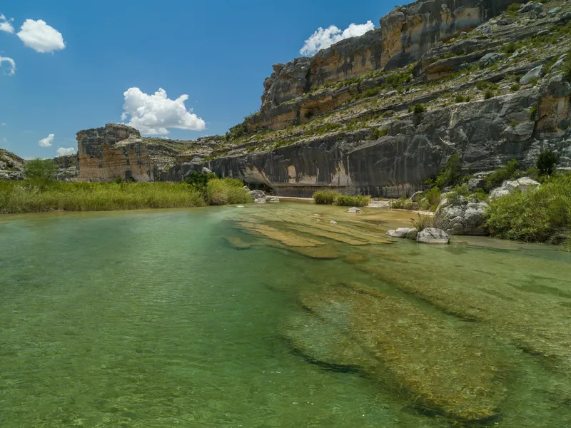WATER: The ranch is bounded by about 14 miles of teal-blue Pecos River, every bit as fetching as the Devils in this area, and sprinkled with azure swimming holes, noisy rapids and car-size lounging boulders. Fishing, swimming, boating and floating are the orders of the day! There are multiple access points on site, and the water/canyon scenery rivals anything seen to the west. A ranch watering system tied to 4 wells allows for additional wildlife and stock water.
