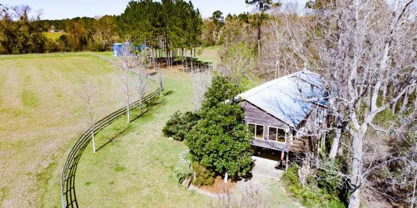 The land is 99 +/- acres of gently rolling, diverse pasture and field, cropland, and natural timber. The showpiece cabin is 2,500 sq. ft. sitting at the top of the hill. 3 bedrooms and 3 baths, large open living room/kitchen/dining area with fireplace. Front and side sun rooms overlooking pastures and woods. Wood floors and gorgeous real wood paneled walls (yellow poplar and rare atlantic white cedar which makes the house smell incredible). The house is lofted on pylons for lots of storage underneath for cars, trailers, and additional shaded seating. A wooden playset sits nearby for the kids. From the house porch, you can watch deer and turkey feeding on the field edges over 500 yards away as the land slopes down towards the Ochlockonee River. A 4040 metal barn with plenty of enclosed and open storage is a short distance from the house perfect for 4 wheelers, supplies, tractors, and more. The house is on well, septic and has power.