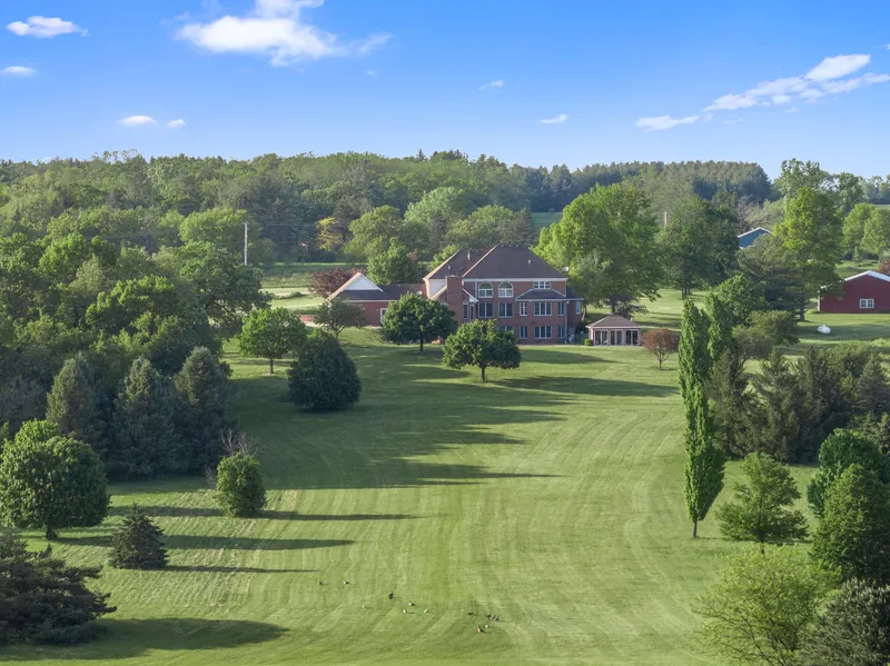 Incredible opportunity to own one of the few remaining large estates with 155 acres. Perfect for the avid hunter or create a family compound. The beautiful property is mixed with hills, woods, stream, trails, and a 20' deep stocked pond. The expansive 6,800 square-foot home is set on a hilltop and offers five spacious bedrooms, four-and-a-half bathrooms, and a completely remodeled walk-out lower level equipped with a handsome kitchen, fireplace, and luxurious full bath. Splash in the pool, dine in the four-season pool house, or roam the trails on your ATV. Ample storage for your recreational toys or treasured car collection in the 50x75 pole barn or the detached heated four-car garage that includes a full bathroom and loft. A rare offering seamlessly blending country with luxury only one hour from Chicago.