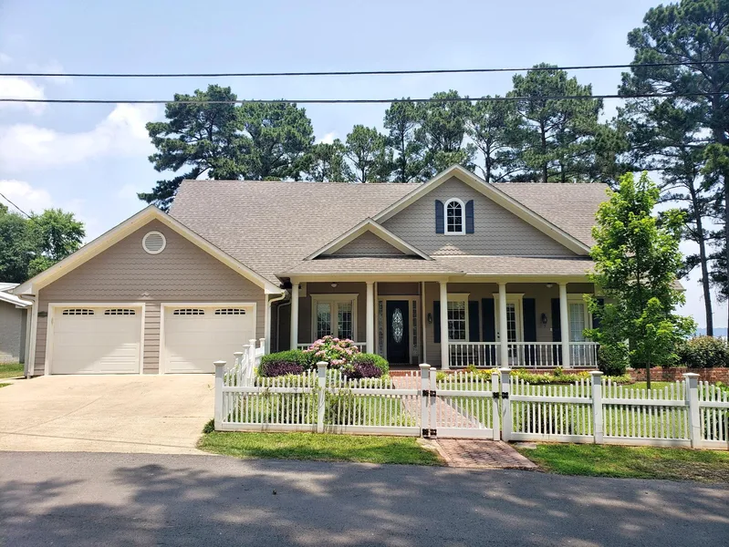Picturesque waterfront lake house near Tyler, Texas on Lake Palestine! Great curb appeal as you drive up to the white picket fence that surrounds the front yard and front of the home with welcoming covered porch. Built in 2003, this property has never been on the market before, having sold off market to the current owner. With 2215 sq. ft., this 3 bedroom 2 bath home has an approximately 186' concrete bulkhead with sidewalk cap and views facing NE over Lake Palestine. Open living, dining, & kitchen have 2 story wall of windows with vaulted wood beamed ceiling overlooking tree shaded landscaped back yard and beyond! Master bedroom & bath on one side of home and guest bedrooms & bath on other side have herringbone faux wood tile. Guest bedrooms have separate entry doors from front porch and a small coffee bar. Living area and den/sunroom are tile and have beautiful 2 sided wood burning stone fireplace. Den/sunroom has sliding windows that open to create screened porch. Open & covered back patio is tree shaded with sidewalk to additional brick shaded patio and down to boathouse. Built-in Dacor gas grill on patio. Large boathouse has 3 stalls with ample seating & storage/refreshment area. A flat aluminum lift bed fills the sailboat lift allowing for storage of kayaks or canoes and can be easily removed. The storage building in the back yard is perfect for lawn & garden tools. Feel the warmth of this incredible lake house and make it