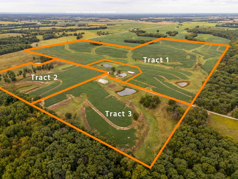 Tract 1: 103 gently rolling acres with approximately 82 acres of farmland. Soils mostly consist of Gorin, Bucklick and Minnith silt loam with 5-9 slope. Improved and maintained terraces, waterways, and draws make up the balance of the land offering hunting and recreation. Good building sites with views of the surrounding landscape. Small pond offering water for wildlife. 3 phase power and county water are available at the road. Access on two sides of the property off County Road 263 and 275.