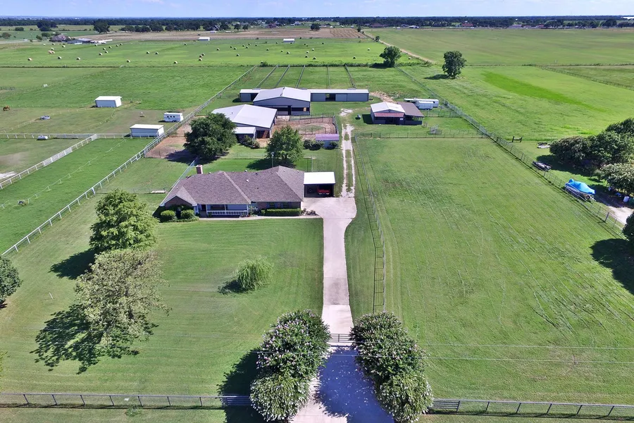The single-story brick home was built in 1995 and provides over 2,100 square feet of interior living space with an open layout shared by the living area with fireplace, kitchen and dining area. There are 3 bedrooms, 2 full baths, an attached 2 car garage and a 1-car carport. Adjoining on the back is a covered patio overlooking a large fenced backyard and the barns.