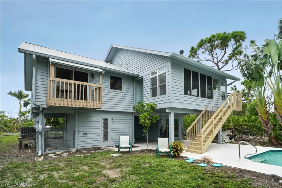2 bedrooms and 3 bathrooms, well maintained home located in the Pineland Area on a HUGE 4 lot parcel! This beautiful home has an additional 2 ground level rooms with their own private entrances that could be used as a home office or generate income as a separate rental. The spacious home boasts an open concept kitchen, with a large center island, warm wood floors, vaulted ceilings and lush green views from every room. The floor to ceiling windows, skylights, art deco light fixtures and stylish french doors makes this home very unique! It even has a very large sunroom attached to the kitchen, adding to its southern charm. The garage has a big attached workroom, well suited for hobbyists, and adds a lot of storage space. The large and shaded outdoor patio is a perfect space for entertaining guests next to the in-ground pool, which is surrounded by lush landscaping exuding a resort style feel. Come home every day and relax in your own private tropical paradise, tucked away in coveted Pine Island!