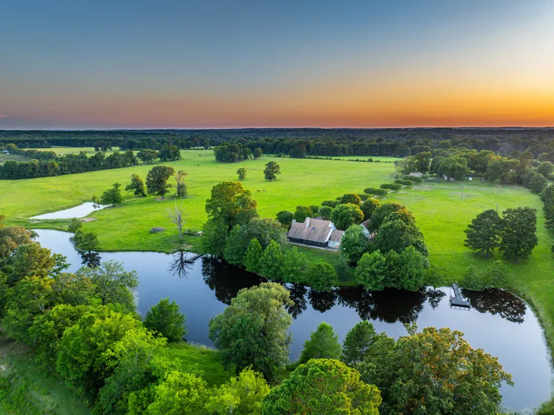 Nestled in the picturesque landscape of Southern Panola County, this stunning East Texas cattle ranch in Timpson spans 100.961+/- beautiful acres of rolling hills and trees. The property is a turn key cattle ranch featuring fencing and cross-fencing throughout, with hog fencing to keep them out. The fertile pastures are ideal for hay and have proven production. Two sets of livestock working pens with barns. Four ponds spread out across the ranch provide ample water for the livestock. The main house is an exquisite stone home exuding charm and elegance. Spanning approximately 2,677 square feet, it boasts four bedrooms, 2 full baths, and one half bath. The interior is adorned with wood beams and accents, enhancing its rustic appeal. A grand stone fireplace with an antique mantle serves as the centerpiece of the living area, while wood and tile flooring throughout add a touch of warmth and sophistication. The home is surrounded by enchanting flower gardens and cozy sitting areas that overlook a breathtaking 2-acre lake surrounded by gorgeous cypress trees at the waters edge. The lake next to the house is stocked full of Florida bass. Perfect to go fishing just outside the back door while enjoying watching many ducks that call the lake home. Adjacent to the main house is a 2-car garage with an upstairs apartment. This open room apartment, complete with a full bath, mirrors the main house's wood accents and offers an ideal guest quarters with added privacy. The property is further enriched with a barn, shop, storage areas, and a vast garden space. Many fruit and pecan trees dot the landscape, adding to the estate's charm and productivity. This exceptional cattle ranch, with its blend of natural beauty and functional amenities, presents a unique opportunity for those seeking a serene and productive rural lifestyle in East Texas.