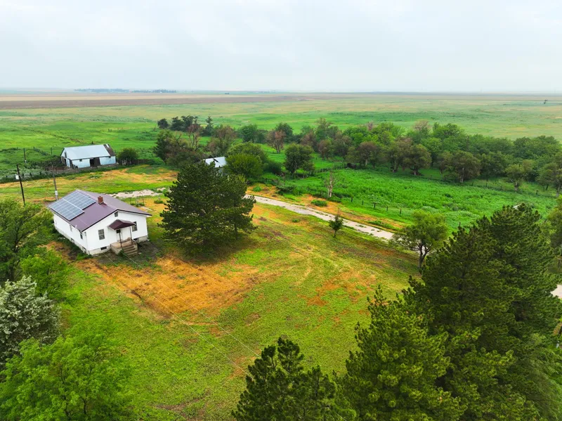 Located less than 9 miles from Ellis, KS, is this pleasant country home and acreage in a quiet area of Trego County. The 2 bedroom, 1 bath home sits on approximately 6 acres along with multiple outbuildings for storage of small equipment and housing livestock. This cozy country home features 960 sq ft of living space on one floor, with a full concrete basement which can be finished out to your liking. The main floor features hardwood floors and great open space flowing from the kitchen to the living room area. The home is powered by a new solar panel unit, water well, and septic system. A mature windbreak on the north boundary provides shade and good shelter from any winter weather conditions.