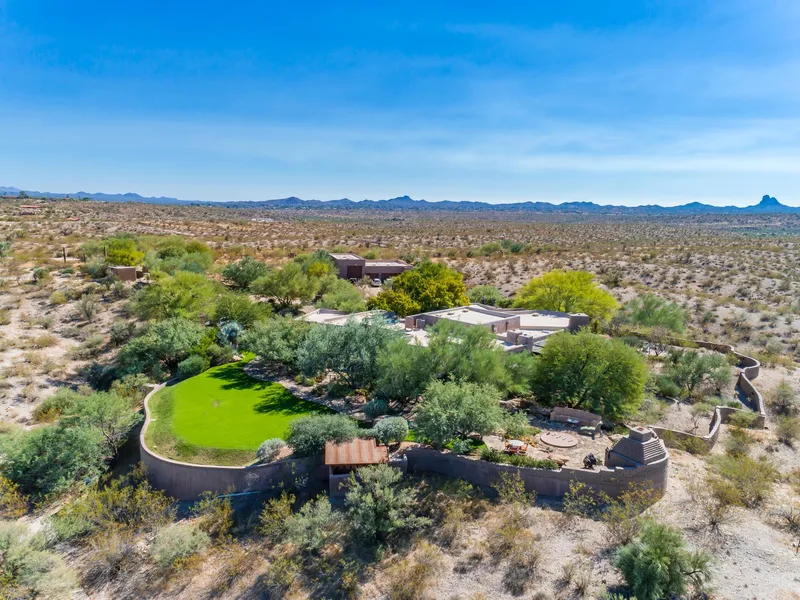The 5,365 SF Santa Fe style main home is constructed of 18 thick adobe walls covered with cement plaster that never needs painting. The cobbled flagstone circle drive provides a grand entrance to the property. Through the front gate is a lushly planted courtyard with a fountain that provides a very relaxing entry.